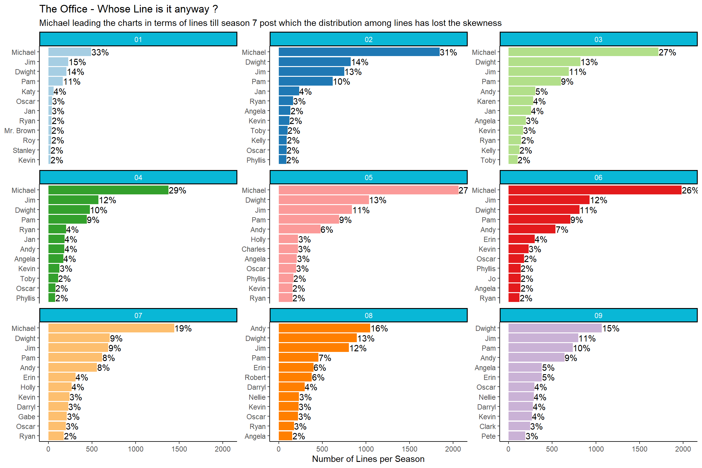 subtitle = "Michael leading the charts in terms of lines till season 7 post which the distribution among lines has lost the skewness ")+